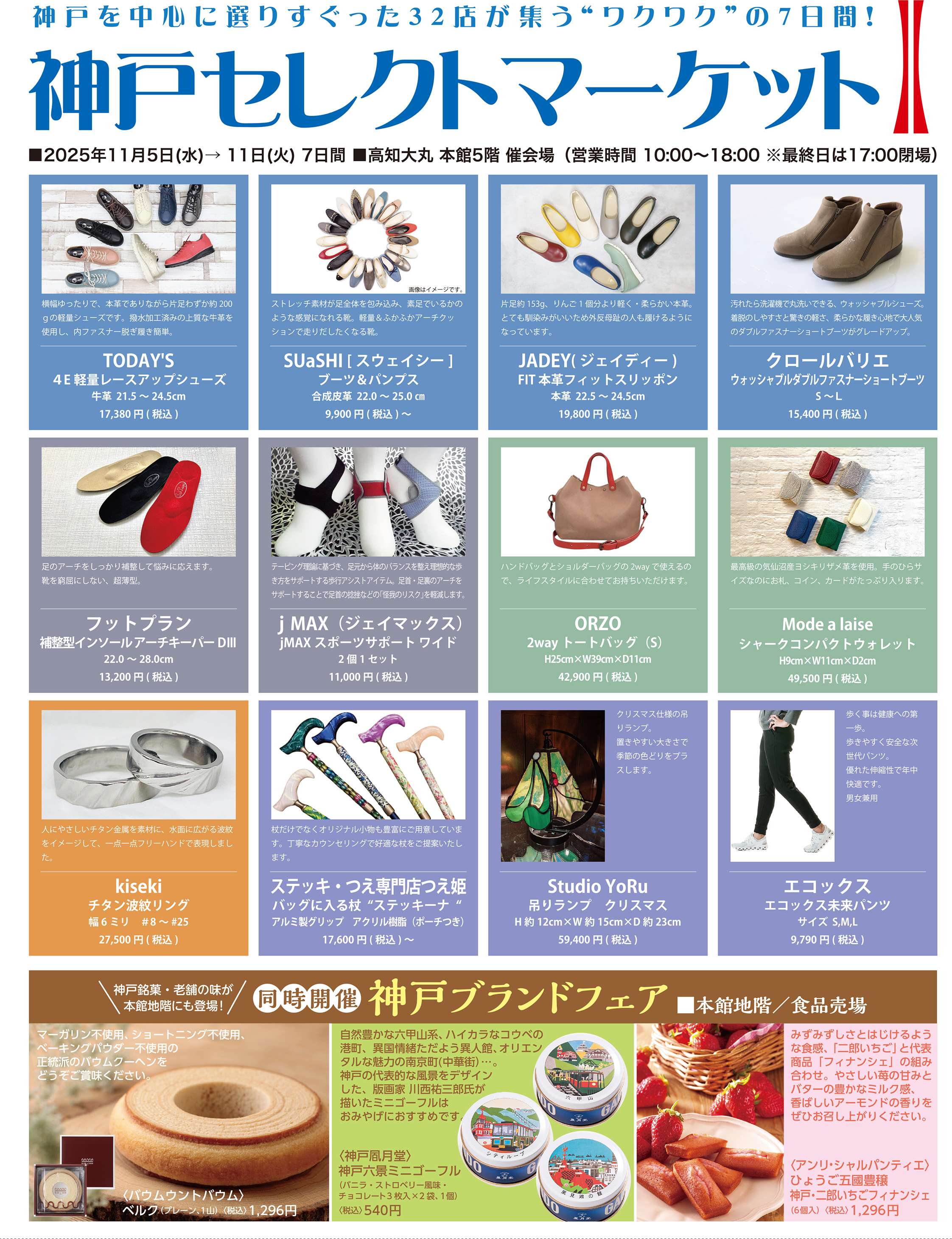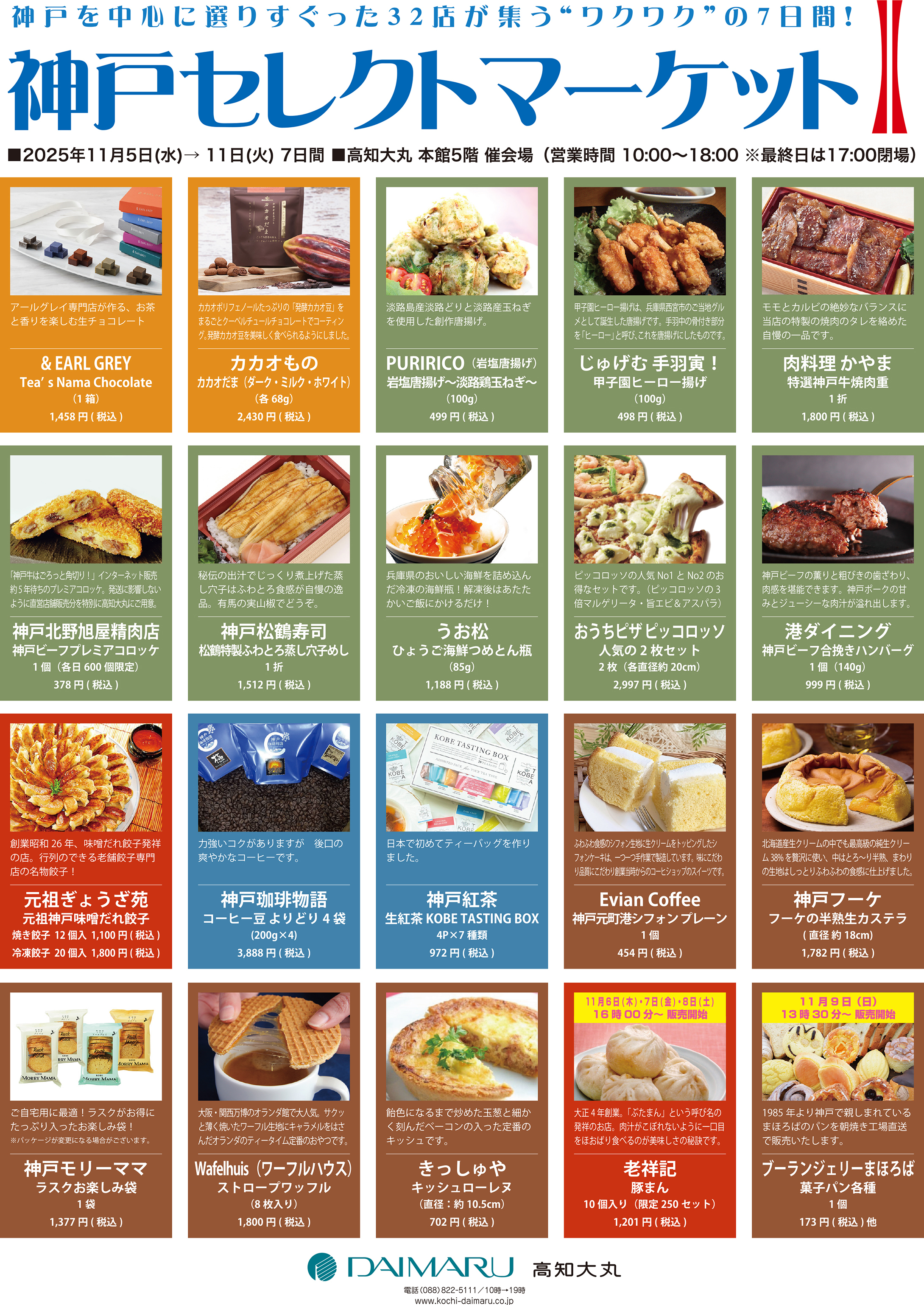 その他 高知大丸 イベント担当 NEW 2025.10.29 神戸セレクトマーケット 今年も神戸の名店が32店舗、高知大丸へ。 限定販売の老舗の豚まんや、人気のパンなど。 神戸ならではのグルメやオシャレを、お楽しみください。 期間 11月5日(水)→11日(火) 場所 本館5階催会場 画像クリックで拡大します。 画像クリックで拡大します。 \おトクな特典!/ 期間中、神戸セレクトマーケット会場でお買物をされると、 会計1回につき1枚、全館(※1)で使える200円お買物券(※2)をプレゼント! ※1:一部除外あり。 ※2:税抜2,000円ごとに1枚ずつご利用いただけます。 冬グルメ イベント 商品情報 スタッフおすすめ 期間限定 BACK 1 2 3 4 ⋯ 106 NEXT